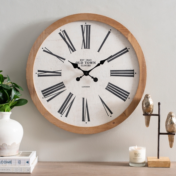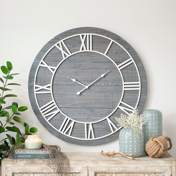 Transform your house into a home by filling the walls with gorgeous wall decor like our black round wood wall clock. Rustic farmhouse barn wood wall clock firstime co. The design concept of this wooden wall clock takes inspiration from vintage train platforms as evidenced by the large number font scale like markings and distressed wood finish on the frame. Country lace large grey roman numeral open face wall clock 27 5 inch by infinity instruments 30 x 31 x 4.